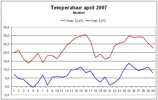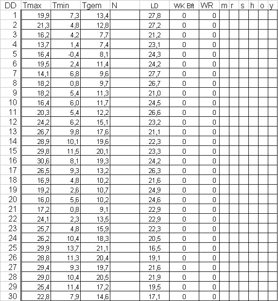 ( T = temperatuur in °C, N = neerslag in mm, LD = luchtdruk in hPa +1000 , WK = windkracht in Beaufort, WR = windrichting, m = mist, r = regen, s = sneeuw, h = hagel, o = onweer en y = ijzel ).