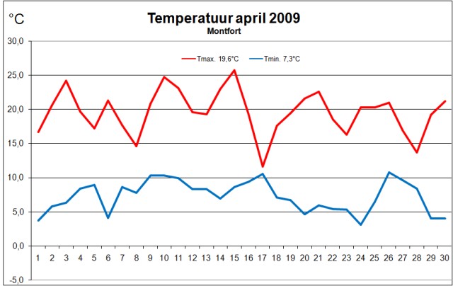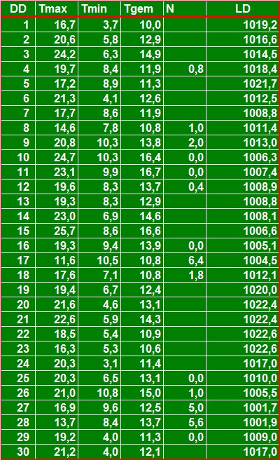 ( T = temperatuur in °C, N = neerslag in mm, LD = luchtdruk in hPa