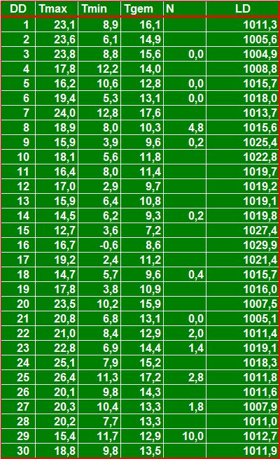 ( T = temperatuur in °C, N = neerslag in mm, LD = luchtdruk in hPa