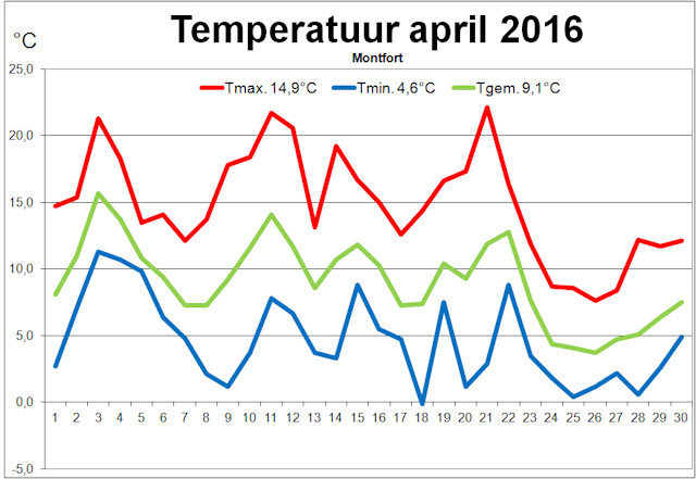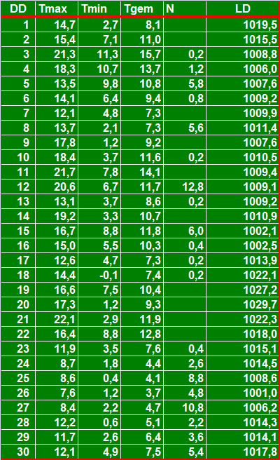 ( T = temperatuur in °C, N = neerslag in mm, LD = luchtdruk in hPa ).