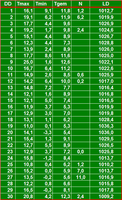 ( T = temperatuur in °C, N = neerslag in mm, LD = luchtdruk in hPa