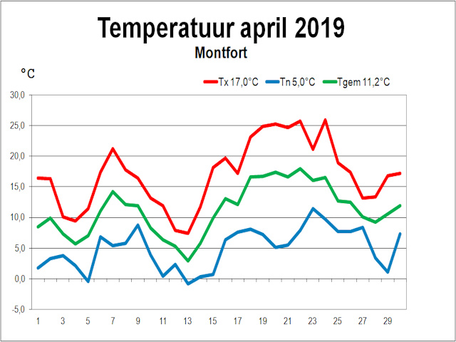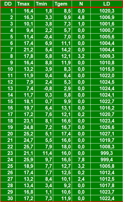 ( T = temperatuur in °C, N = neerslag in mm, LD = luchtdruk in hPa