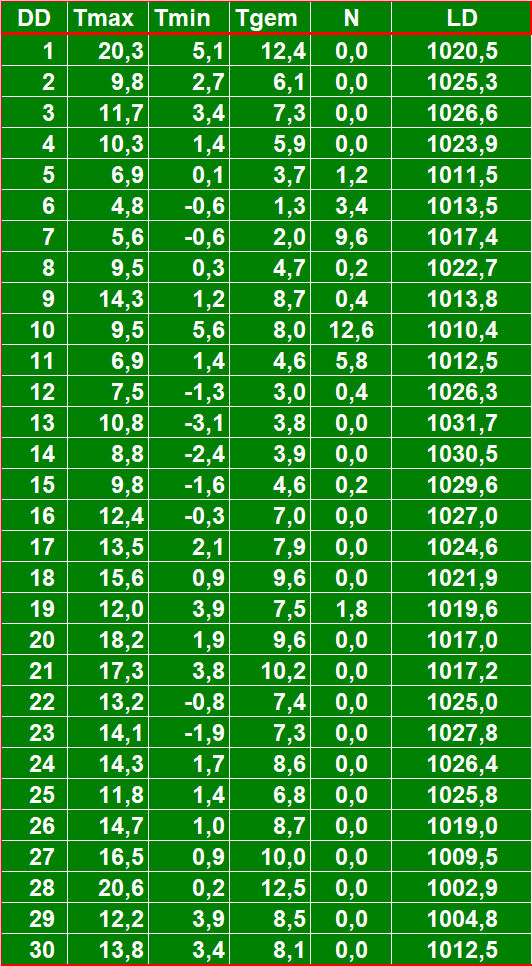 ( T = temperatuur in °C, N = neerslag in mm, LD = luchtdruk in hPa