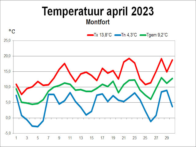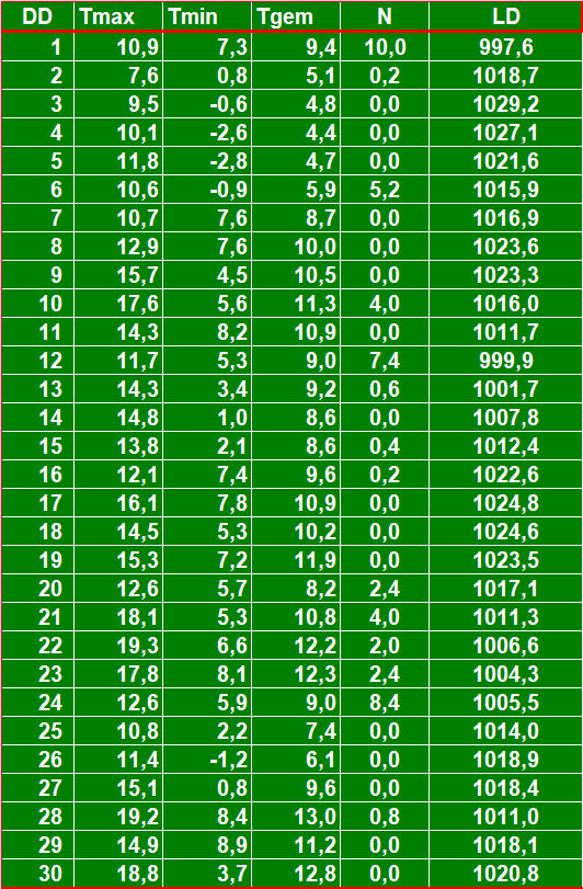 ( T = temperatuur in °C, N = neerslag in mm, LD = luchtdruk in hPa
