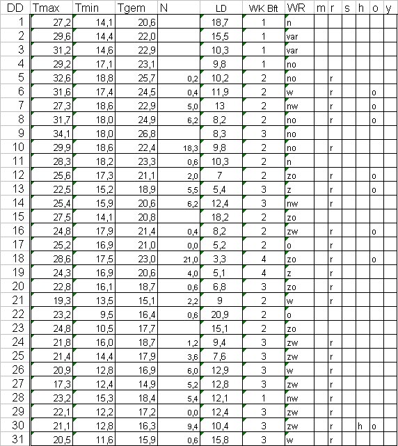 ( T = temperatuur in °C, N = neerslag in mm, LD = luchtdruk in hPa + 1000, WK = windkracht in Beaufort, WR = windrichting, m = mist, r = regen, s = sneeuw, h = hagel, o = onweer en y = ijzel ).