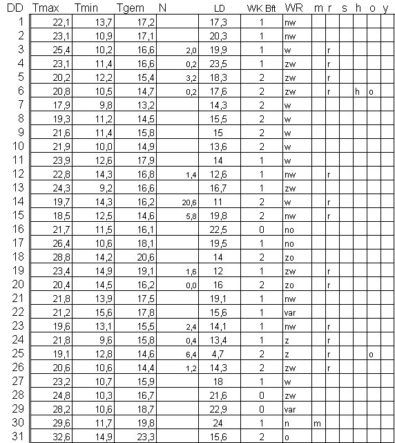 ( T = temperatuur in °C, N = neerslag in mm, LD = luchtdruk in hPa +1000 , WK = windkracht in Beaufort, WR = windrichting, m = mist, r = regen, s = sneeuw, h = hagel, o = onweer en y = ijzel ).