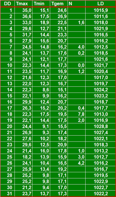 ( T = maximum- minimum- en 24-uursgemiddelde temperatuur in °C, N = neerslag in mm, LD = gemiddelde luchtdruk in hPa ).