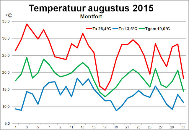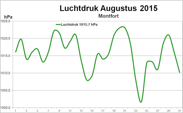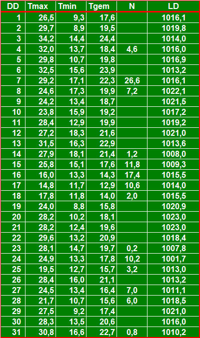 ( T = maximum- minimum- en 24-uursgemiddelde temperatuur in °C, N = neerslag in mm, LD = gemiddelde luchtdruk in hPa ).