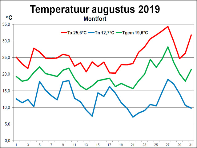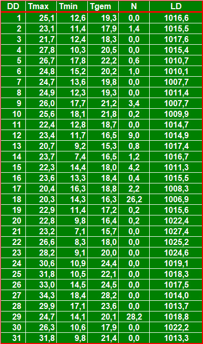 ( T = maximum- minimum- en 24-uursgemiddelde temperatuur in °C, N = neerslag in mm, LD = gemiddelde luchtdruk in hPa ).