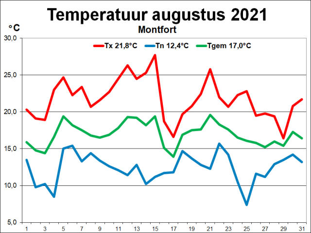 ( T = maximum- minimum- en 24-uursgemiddelde temperatuur in °C, N = neerslag in mm, LD = gemiddelde luchtdruk in hPa ).