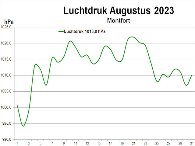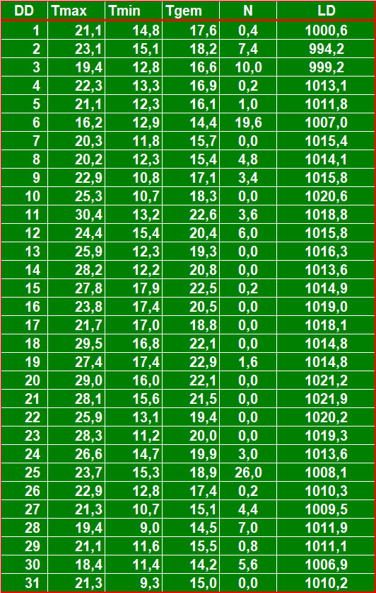 ( T = maximum- minimum- en 24-uursgemiddelde temperatuur in °C, N = neerslag in mm, LD = gemiddelde luchtdruk in hPa ).