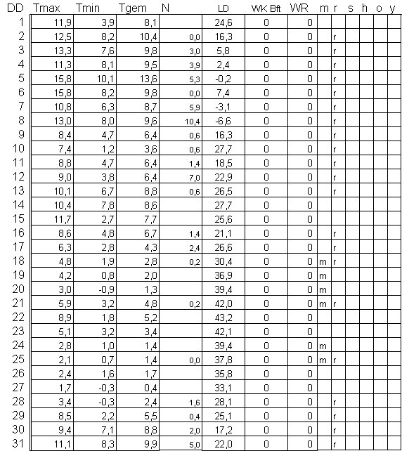 ( T = temperatuur in °C, N = neerslag in mm, LD = luchtdruk in hPa + 1000, WK = windkracht in Beaufort, WR = windrichting, m = mist, r = regen, s = sneeuw, h = hagel, o = onweer en y = ijzel ).