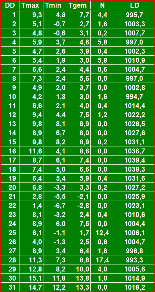 ( T = temperatuur in °C, N = neerslag in mm, LD = luchtdruk in hPa ).