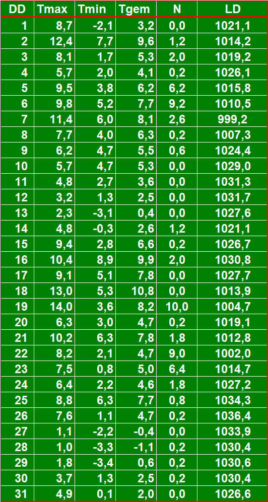 ( T = temperatuur in °C, N = neerslag in mm, LD = luchtdruk in hPa ).