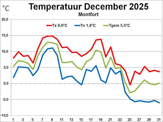 ( T = temperatuur in °C, N = neerslag in mm, LD = luchtdruk in hPa ).