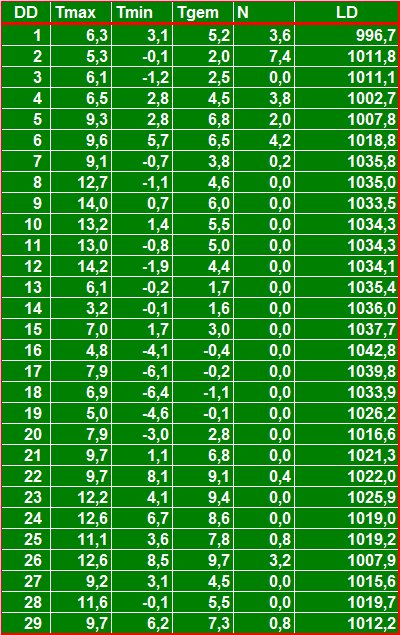( T = temperatuur in °C, N = neerslag in mm, LD = luchtdruk in hPa