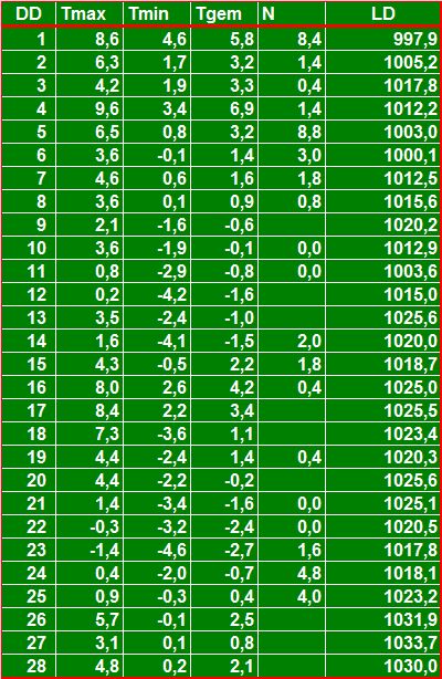 ( T = temperatuur in °C, N = neerslag in mm, LD = luchtdruk in hPa ).