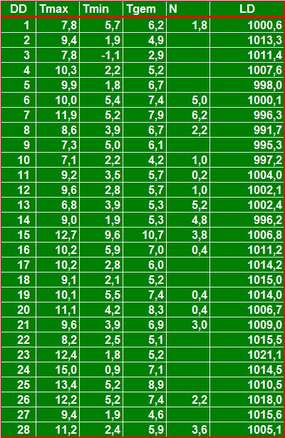 ( T = temperatuur in °C, N = neerslag in mm, LD = luchtdruk in hPa ).