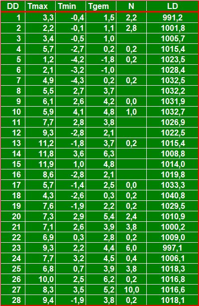( T = temperatuur in °C, N = neerslag in mm, LD = luchtdruk in hPa ).