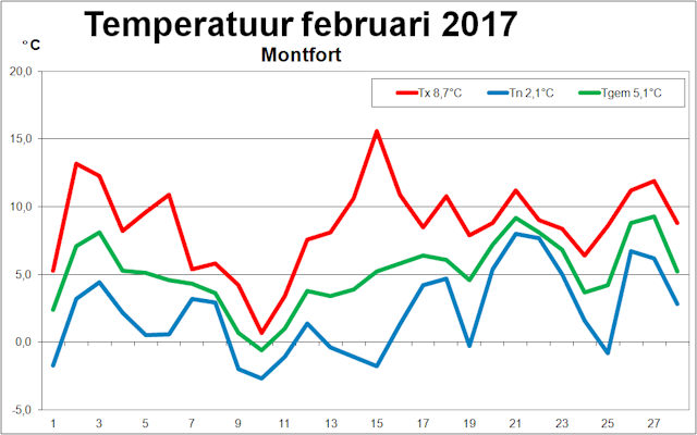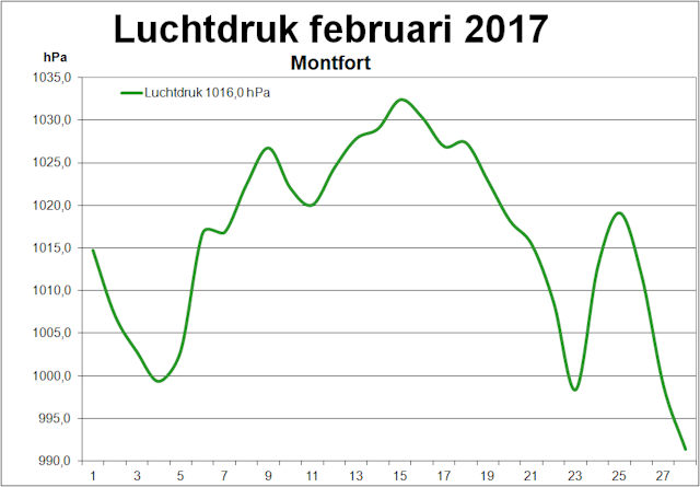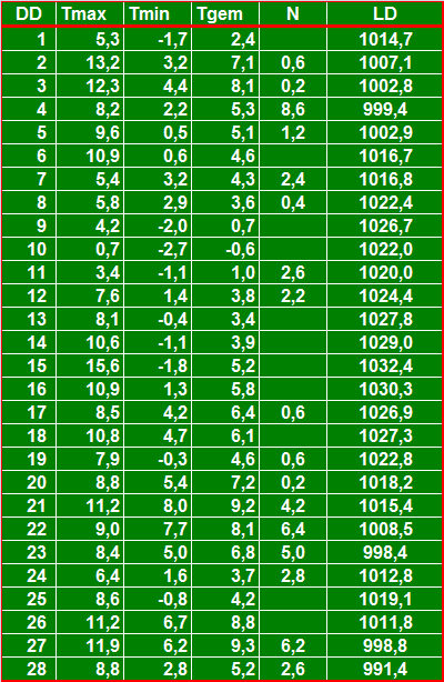 ( T = temperatuur in °C, N = neerslag in mm, LD = luchtdruk in hPa ).