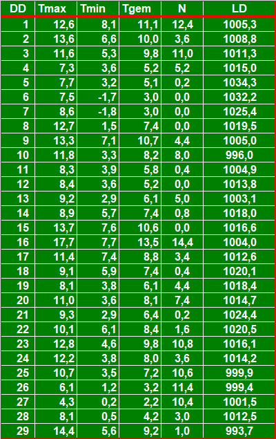 ( T = temperatuur in °C, N = neerslag in mm, LD = luchtdruk in hPa ).