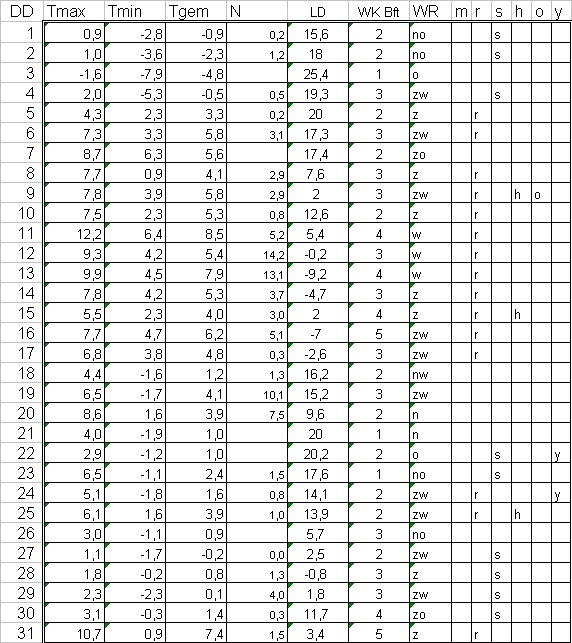 ( T = temperatuur in °C, N = neerslag in mm, LD = luchtdruk in hPa + 1000, WK = windkracht in Beaufort, WR = windrichting, m = mist, r = regen, s = sneeuw, h = hagel, o = onweer en y = ijzel ).