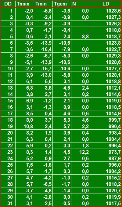 ( T = temperatuur in °C, N = neerslag in mm, LD = luchtdruk in hPa)
