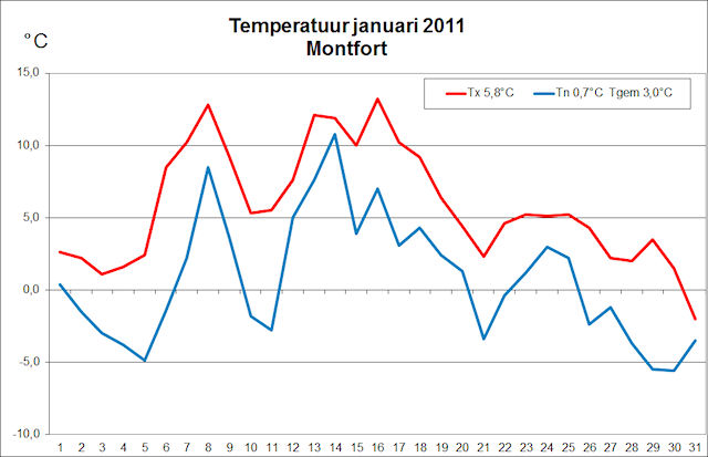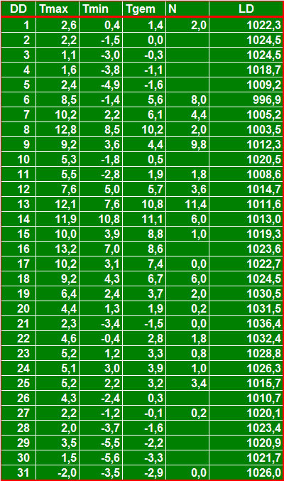 ( T = temperatuur in °C, N = neerslag in mm, LD = luchtdruk in hPa ).