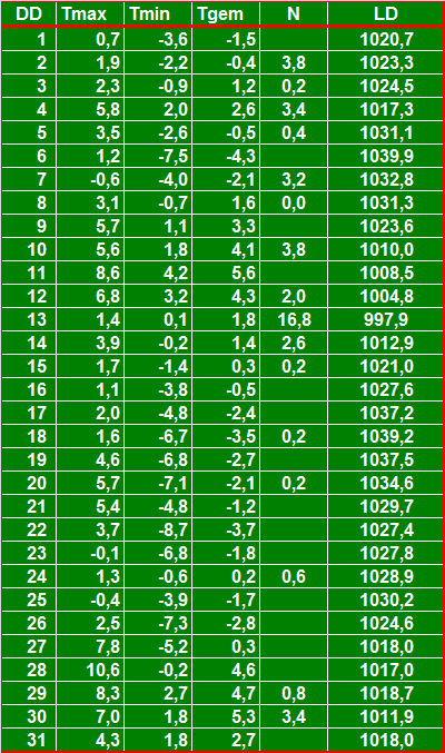 ( T = temperatuur in °C, N = neerslag in mm, LD = luchtdruk in hPa ).