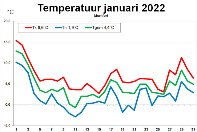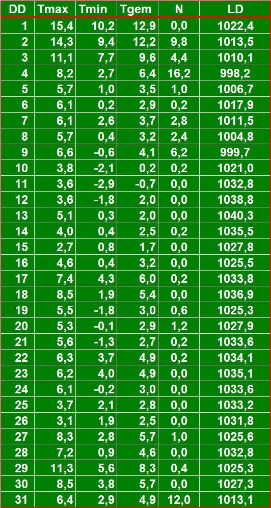 ( T = temperatuur in °C, N = neerslag in mm, LD = luchtdruk in hPa ).