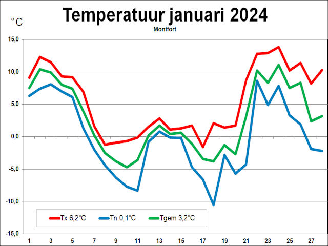 ( T = temperatuur in °C, N = neerslag in mm, LD = luchtdruk in hPa ).
