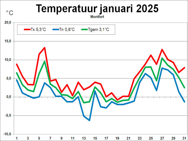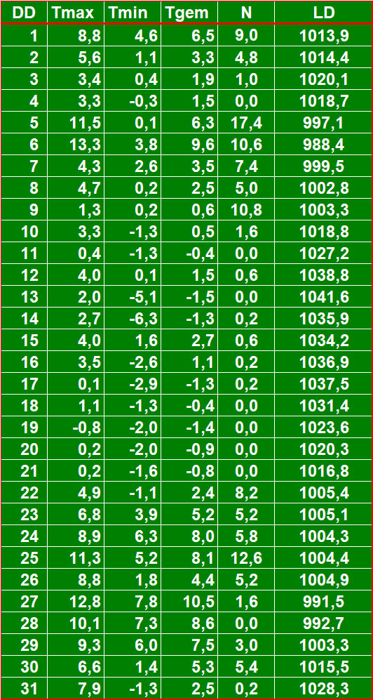 ( T = temperatuur in °C, N = neerslag in mm, LD = luchtdruk in hPa ).