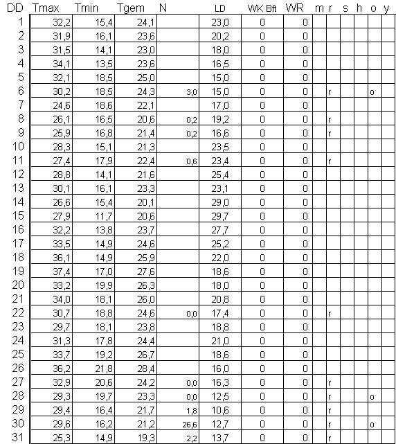 ( T = temperatuur in °C, N = neerslag in mm, LD = luchtdruk in hPa +1000 , WK = windkracht in Beaufort, WR = windrichting, m = mist, r = regen, s = sneeuw, h = hagel, o = onweer en y = ijzel ).