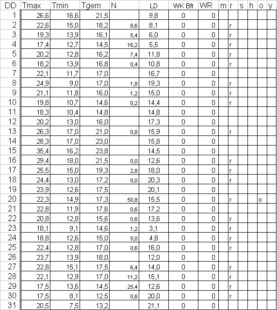 ( T = temperatuur in °C, N = neerslag in mm, LD = luchtdruk in hPa +1000, m = mist, r = regen, s = sneeuw, h = hagel, o = onweer en y = ijzel ).