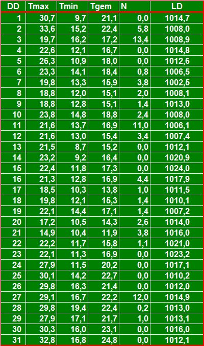 ( T = temperatuur in °C, N = neerslag in mm, LD = luchtdruk ).