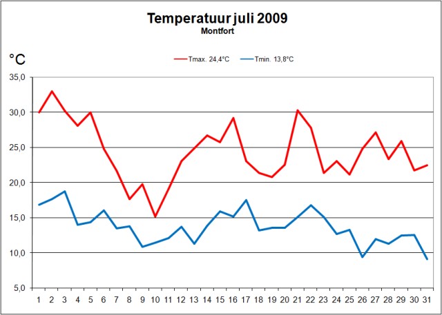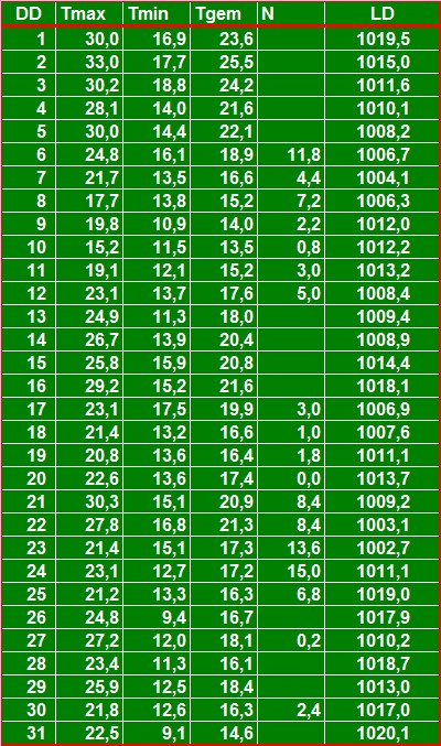 ( T = temperatuur in °C, N = neerslag in mm, LD = luchtdruk ).