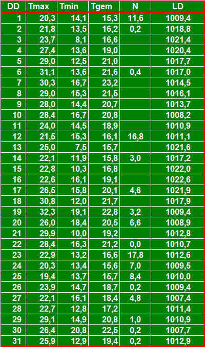 ( T = temperatuur in °C, N = neerslag in mm, LD = luchtdruk in hPa