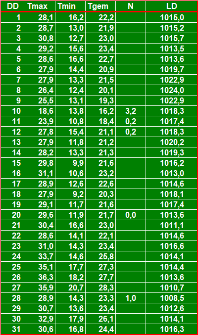 ( T = temperatuur in °C, N = neerslag in mm, LD = luchtdruk in hPa