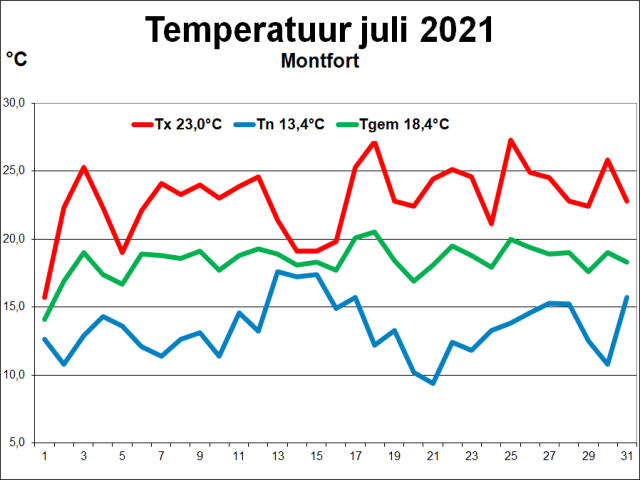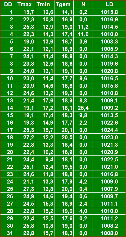( T = temperatuur in °C, N = neerslag in mm, LD = luchtdruk in hPa
