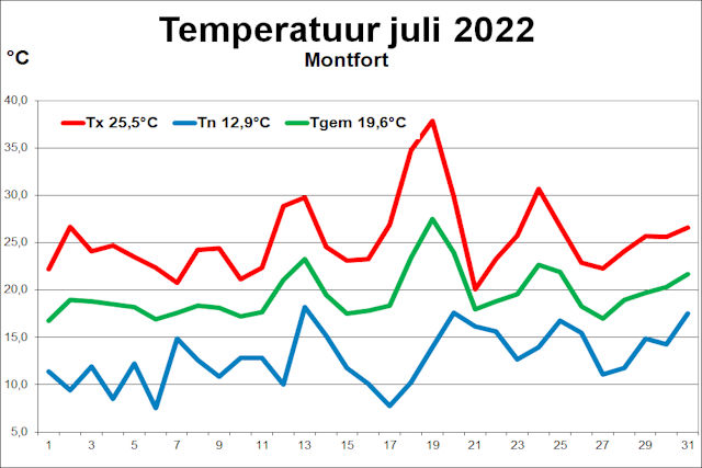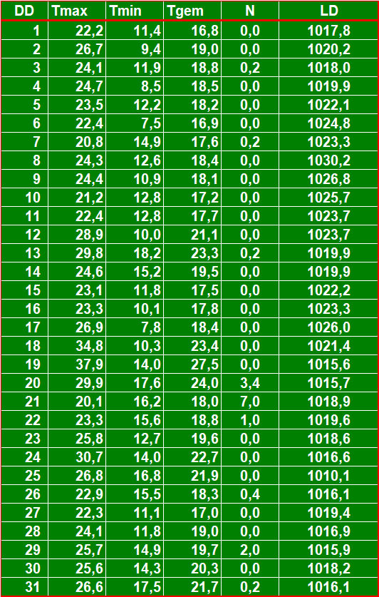 ( T = temperatuur in °C, N = neerslag in mm, LD = luchtdruk in hPa