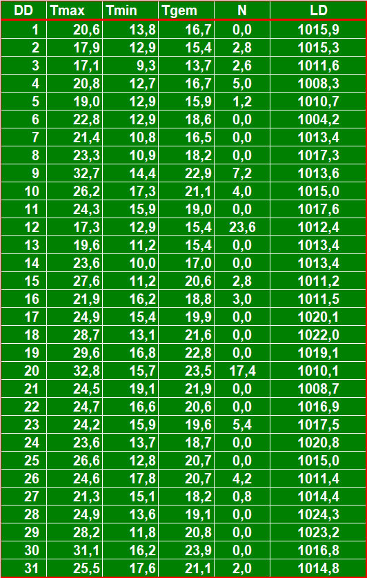 ( T = temperatuur in °C, N = neerslag in mm, LD = luchtdruk in hPa