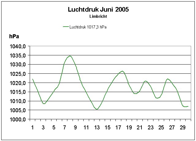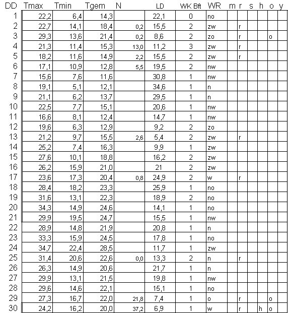 ( T = temperatuur in °C, N = neerslag in mm, LD = luchtdruk in hPa +1000 , WK = windkracht in Beaufort, WR = windrichting, m = mist, r = regen, s = sneeuw, h = hagel, o = onweer en y = ijzel ).