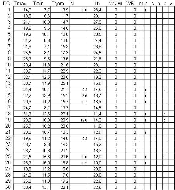 ( T = temperatuur in °C, N = neerslag in mm, LD = luchtdruk in hPa +1000 , WK = windkracht in Beaufort, WR = windrichting, m = mist, r = regen, s = sneeuw, h = hagel, o = onweer en y = ijzel ).