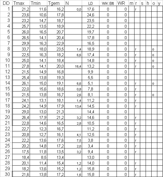 ( T = temperatuur in °C, N = neerslag in mm, LD = luchtdruk in hPa +1000 , WK = windkracht in Beaufort, WR = windrichting, m = mist, r = regen, s = sneeuw, h = hagel, o = onweer en y = ijzel ).