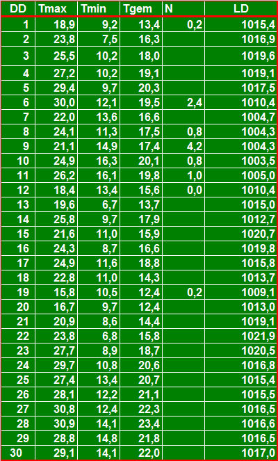 ( T = temperatuur in °C, N = neerslag in mm, LD = luchtdruk in hPa