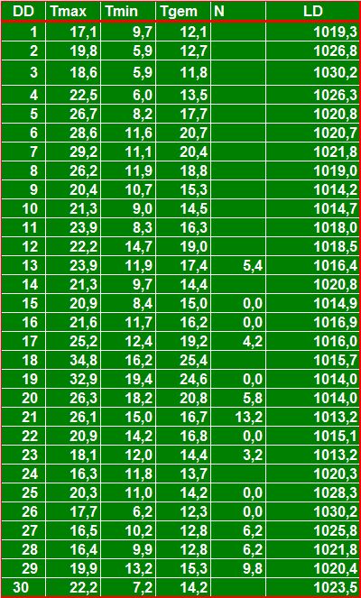 ( T = temperatuur in °C, N = neerslag in mm, LD = luchtdruk in hPa
