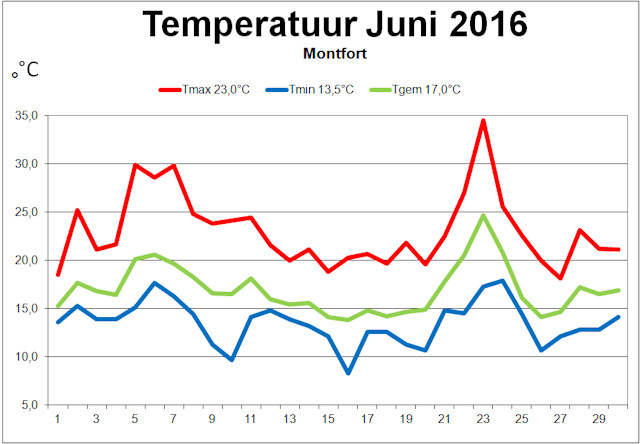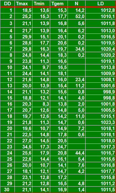 ( T = temperatuur in °C, N = neerslag in mm, LD = luchtdruk in hPa