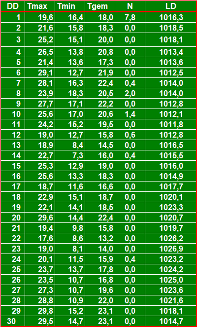 ( T = temperatuur in °C, N = neerslag in mm, LD = luchtdruk in hPa