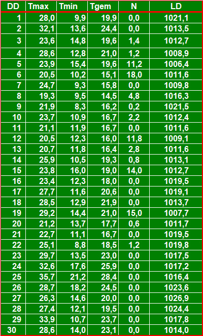 ( T = temperatuur in °C, N = neerslag in mm, LD = luchtdruk in hPa