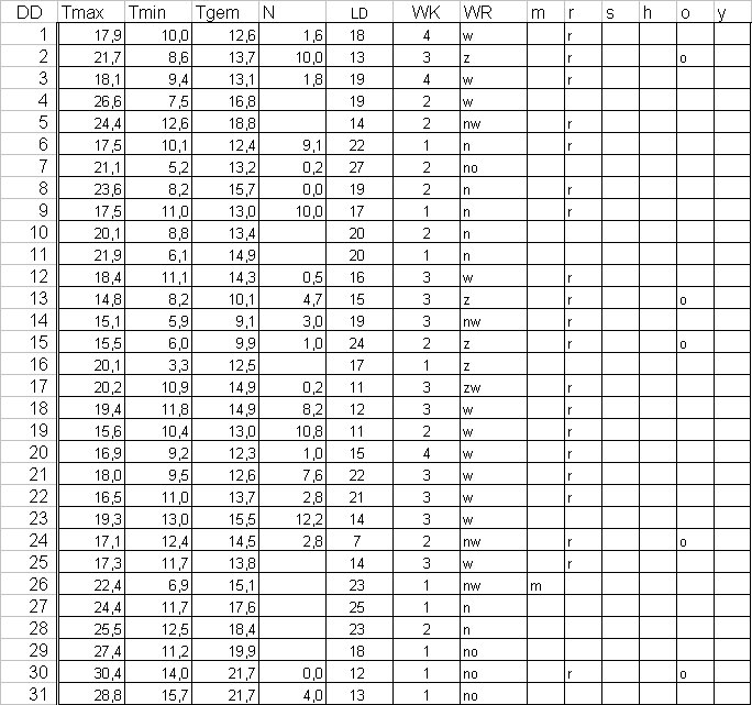 ( T = temperatuur in °C, N = neerslag in mm, LD = luchtdruk in hPa + 1000, WK = windkracht in Beaufort, WR = windrichting, m = mist, r = regen, s = sneeuw, h = hagel, o = onweer en y = ijzel ).